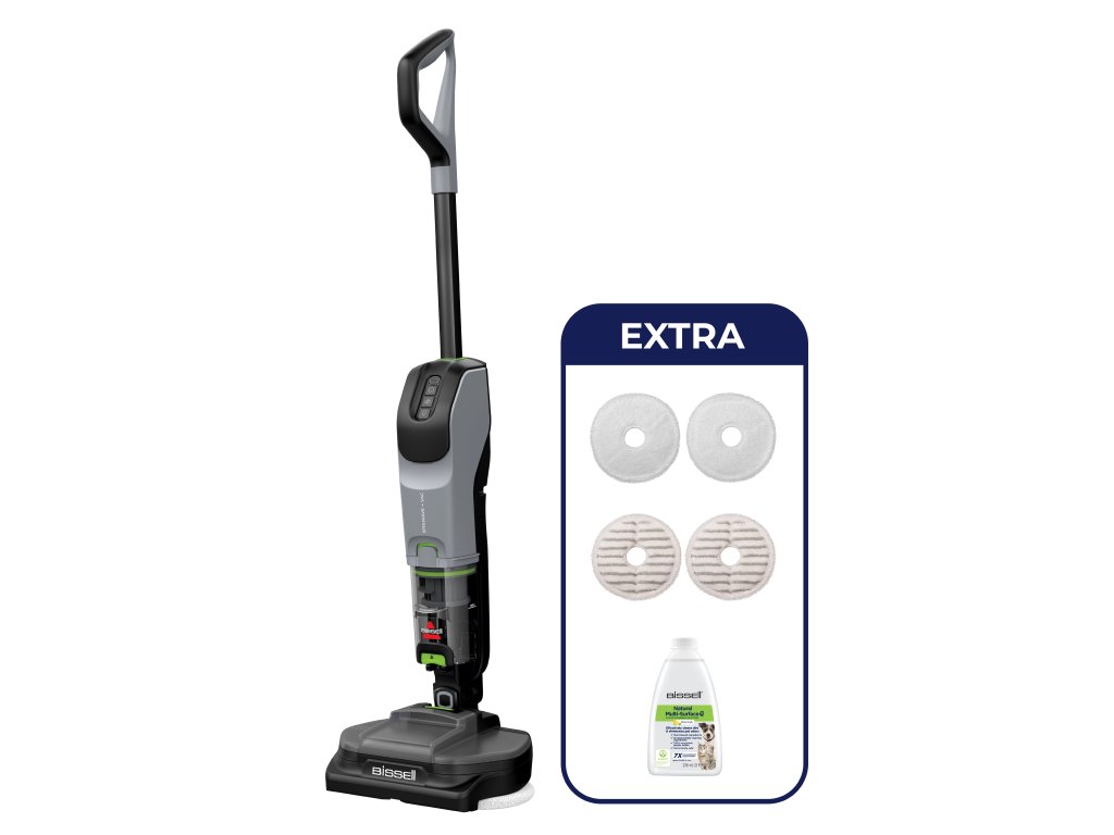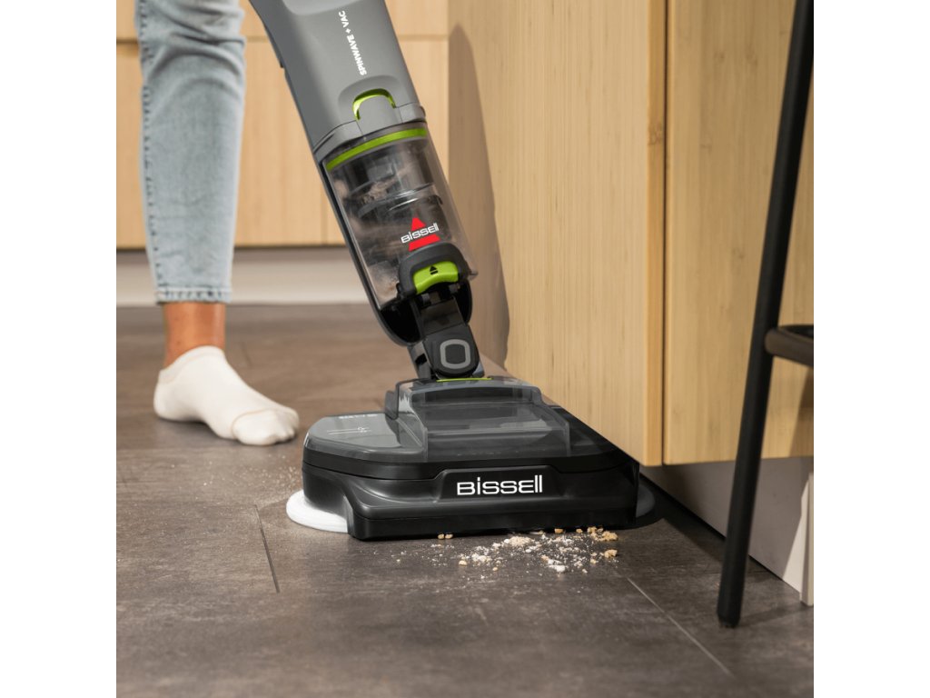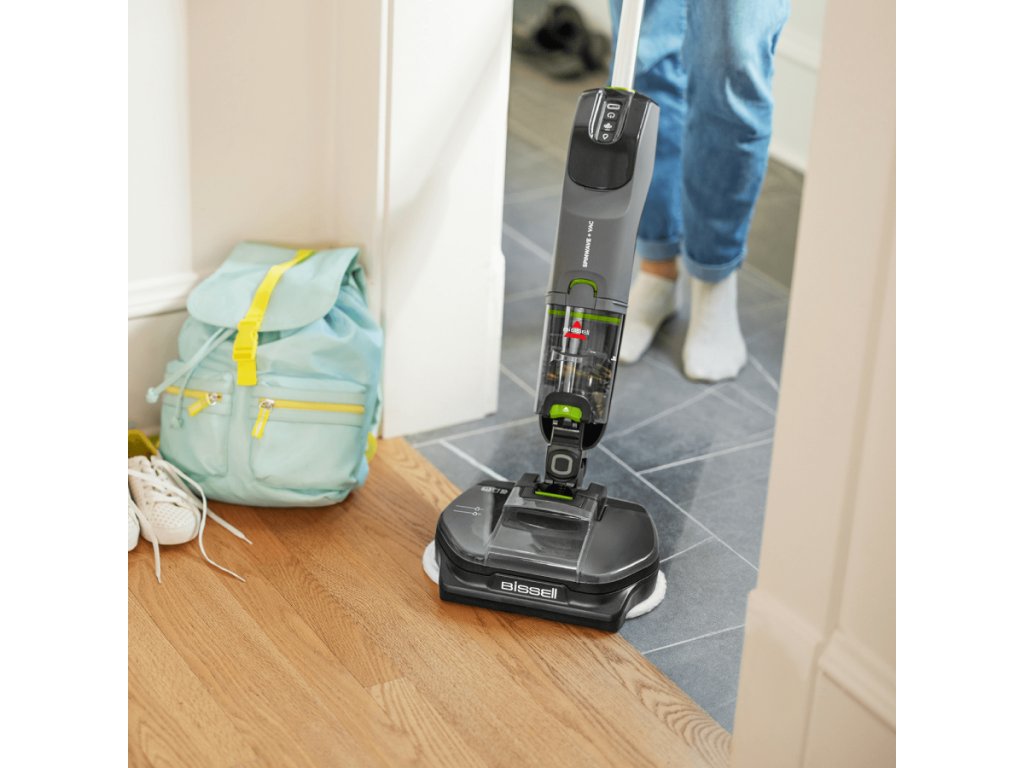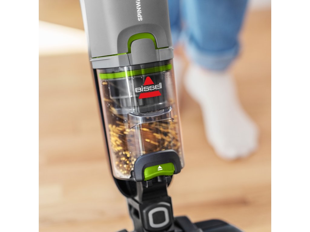 Akumulátorový víceúčelový vysavač na tvrdé podlahy BISSELL® SpinWave® + Vac Pet Select zajišťuje bezprašné vytírání a cyklónové vysávání suchých nečistot z tvrdých podlah v jednom kroku.